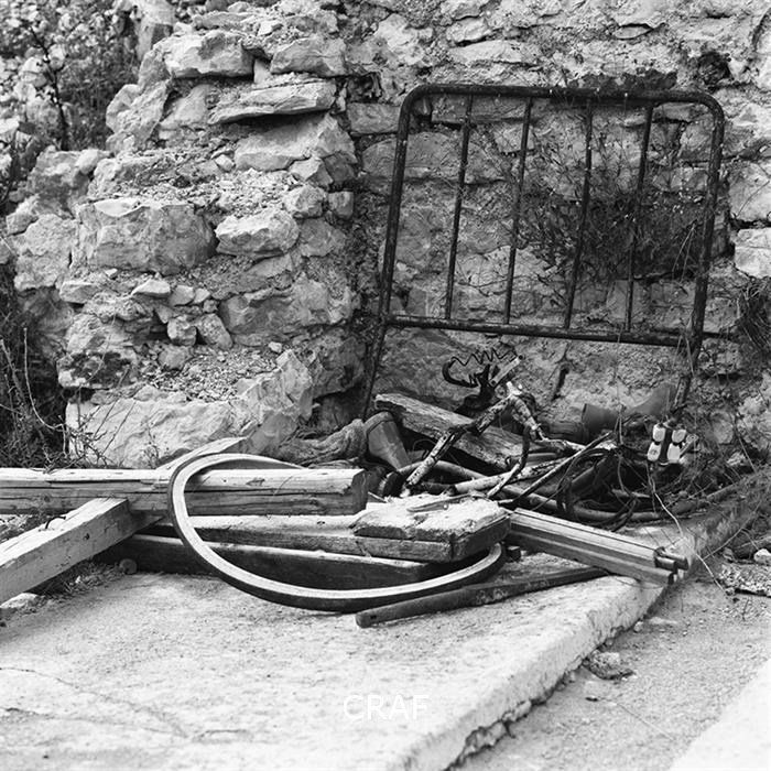 Veduta di alcuni ruderi di una casa, travi di legno accatastate, la testiera in...