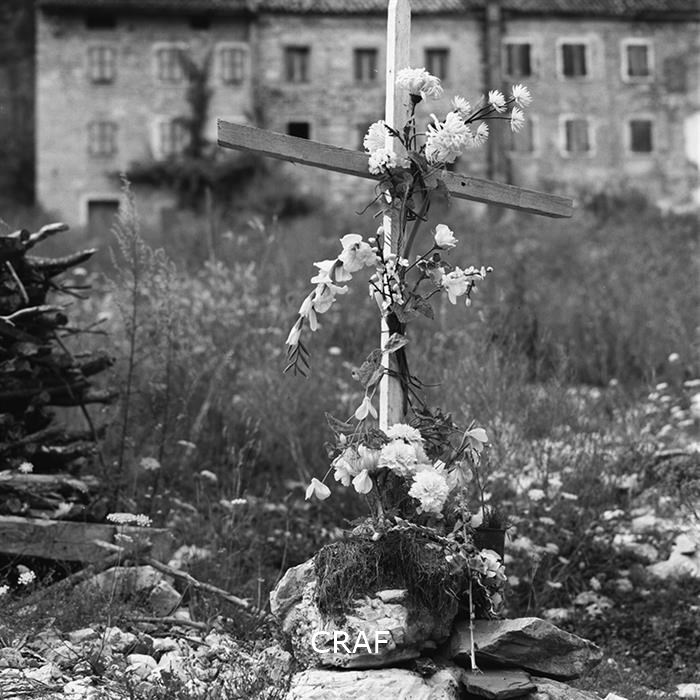 Veduta di alcuni ruderi: una croce con dei fiori finiti