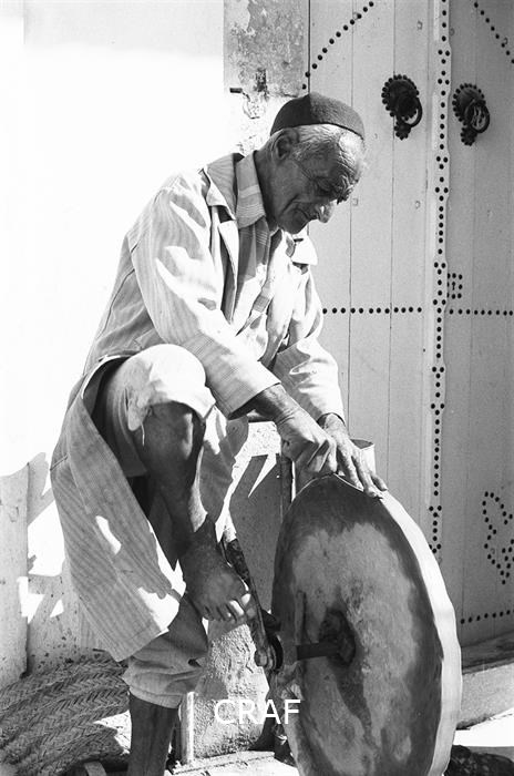 Ritratto di un uomo mentre affila coltelli attraverso una mola di pietra a...