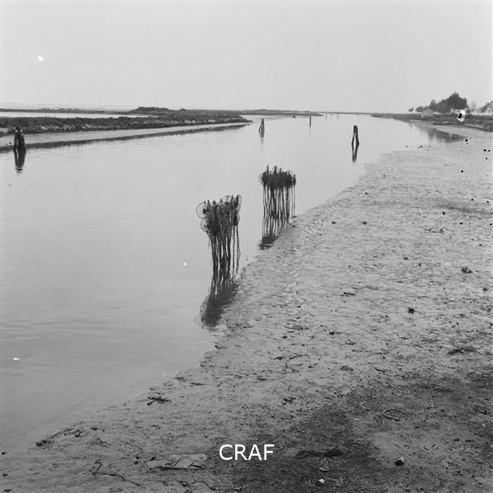 Veduta di un canale lagunare e delle reti da pesca ai bordi del canale