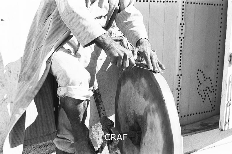 Particolare di un uomo mentre affila coltelli attraverso una mola di pietra a...