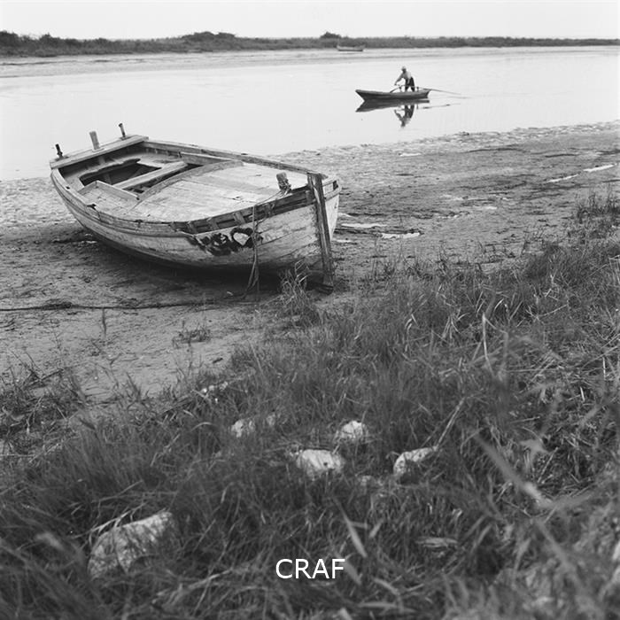 Veduta di una barca abbandonata ai bordi di un canale lagunare; sullo sfondo un...