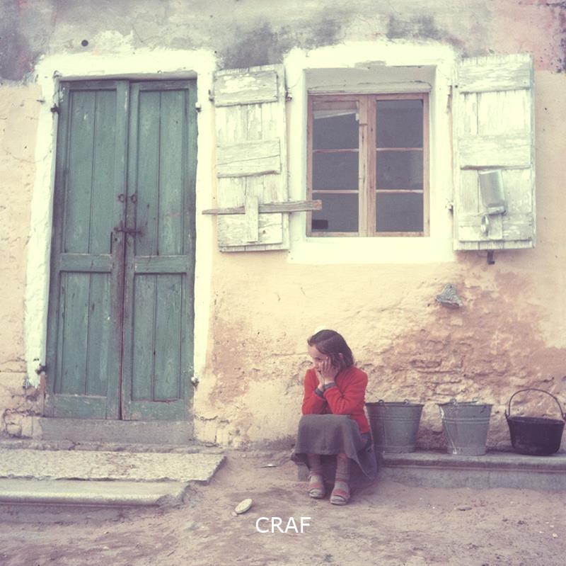 L'immagine ritrae una bambina seduta fuori da un'abitazione modesta, mentre si...