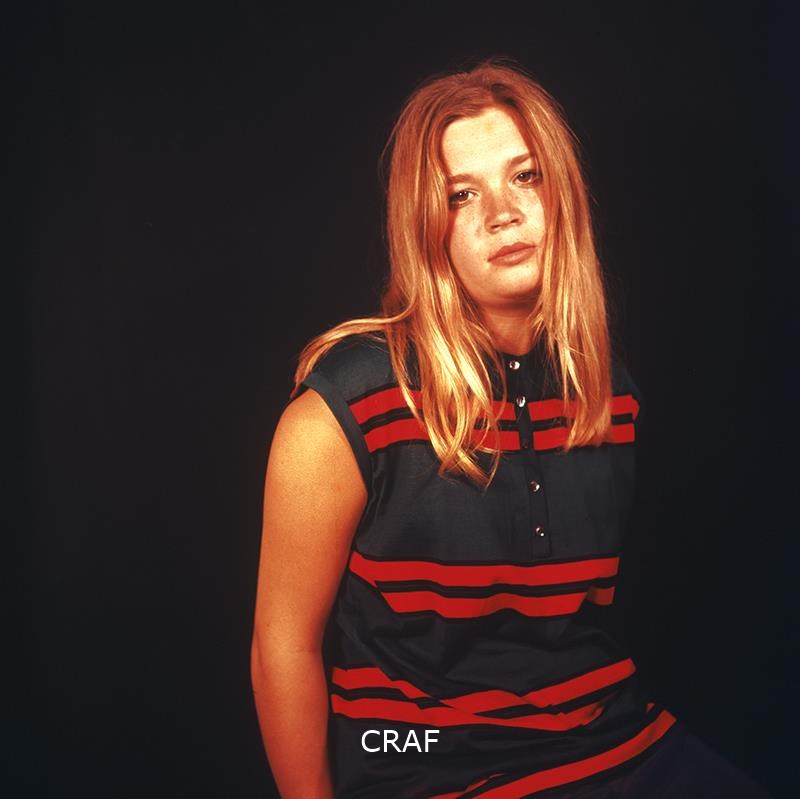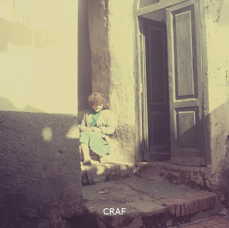 Ritratto di una giovane donna seduta sulla soglia di casa.