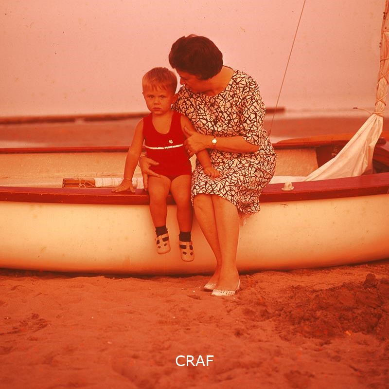 Ritratto di un bambino e una donna seduti sul bordo di una barca, sulla...