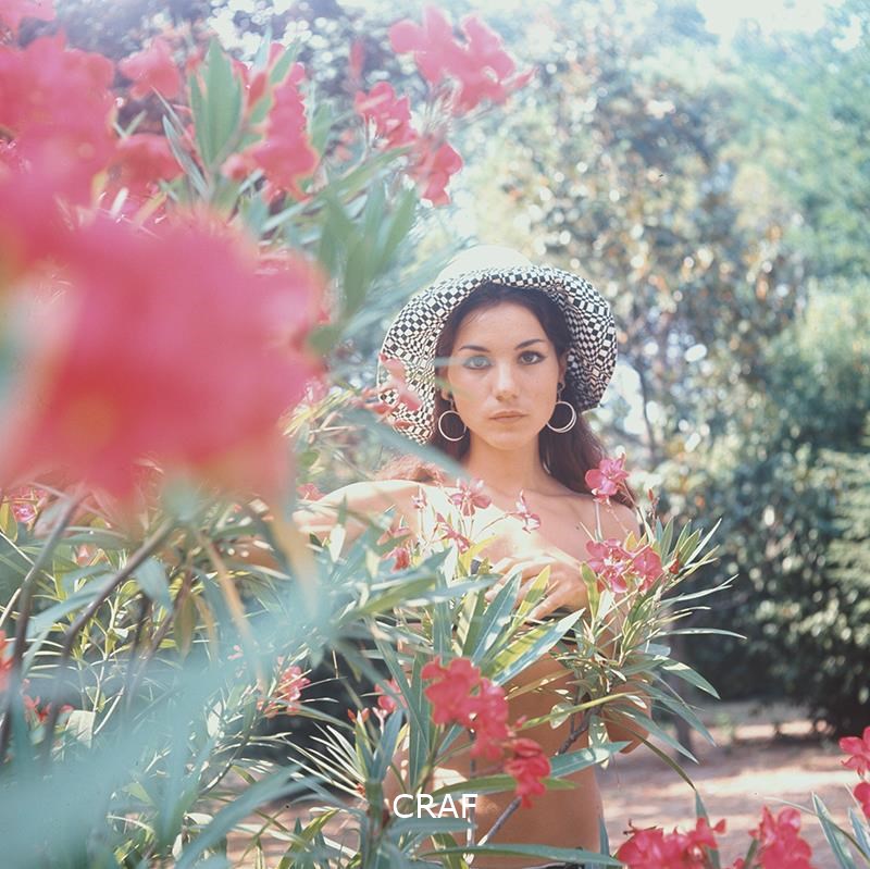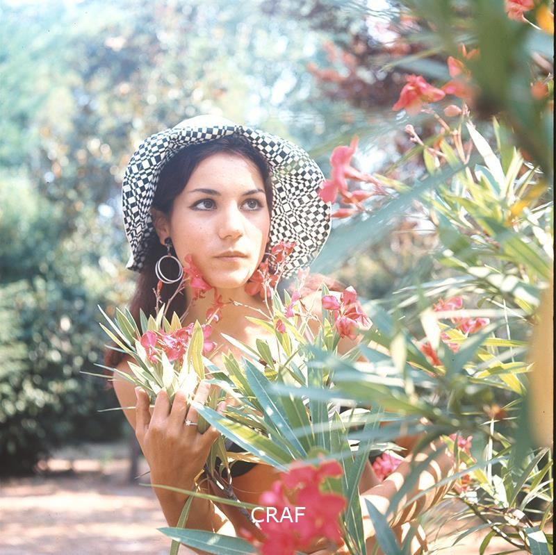 Ritratto di una giovane donna con cappello in posa tra i fiori di un oleandro.