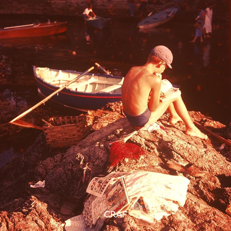 Ritratto di un bambino che legge i fumetti sugli scogli in una giornata estiva.