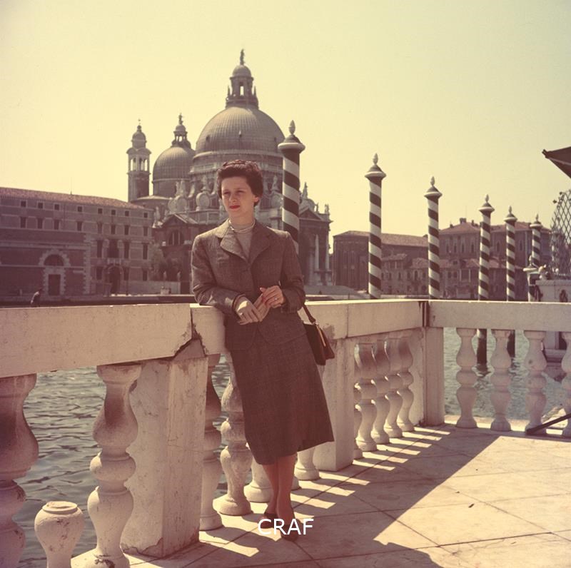 L'immagine ritrae una donna in tailleur che posa appoggiata ad una balaustra...
