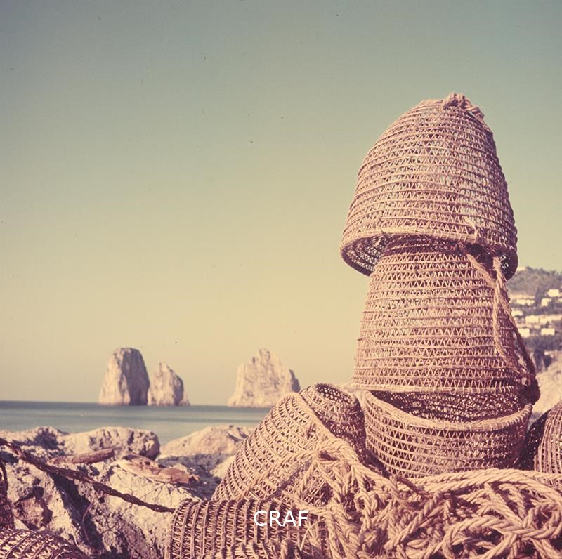 L'immagine ritrae alcune nasse in giunco impilate sugli scogli. In lontananza...