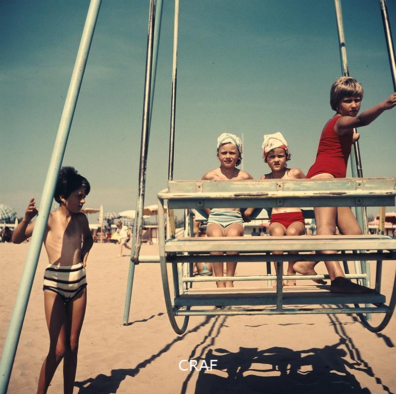 Un gruppo di bambine gioca sul dondolo, in spiaggia.