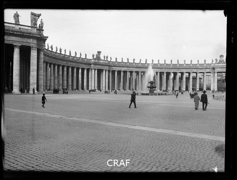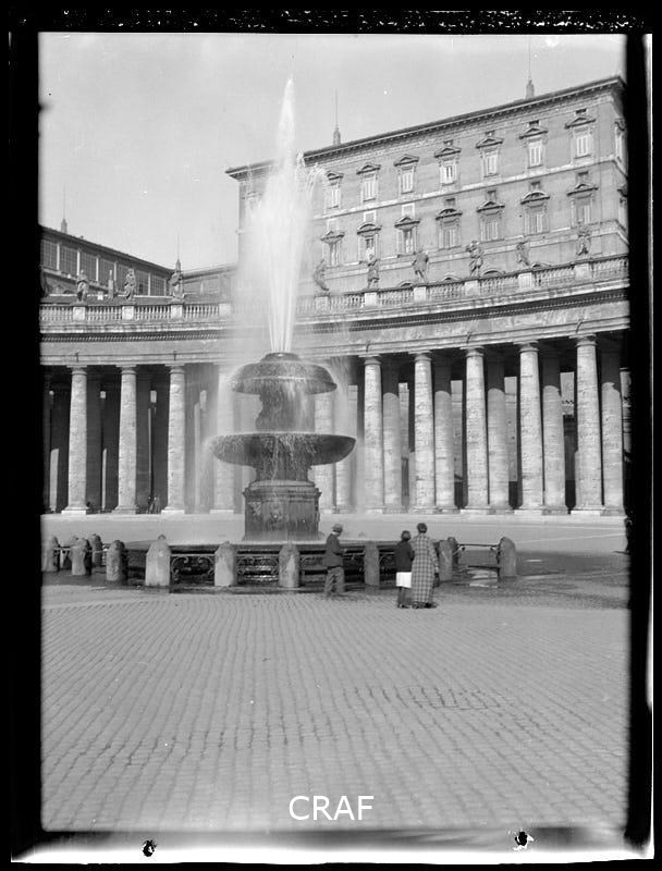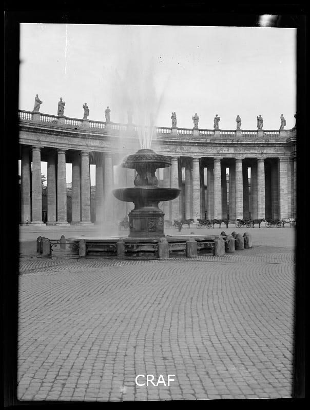 Veduta del Colonnato di San Pietro a Roma con una delle due Fontane gemelle di...