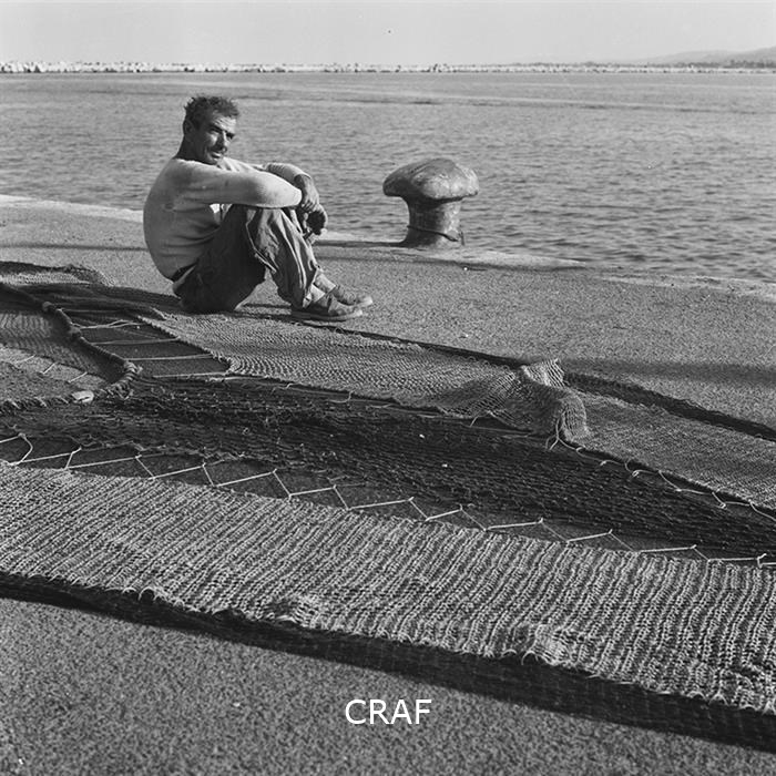 Ritratto di un uomo seduto sul molo accanto a delle reti da pesca