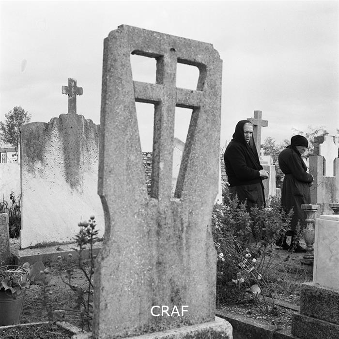 L'immagine ritrae una lapide e due donne anziane in un cimitero