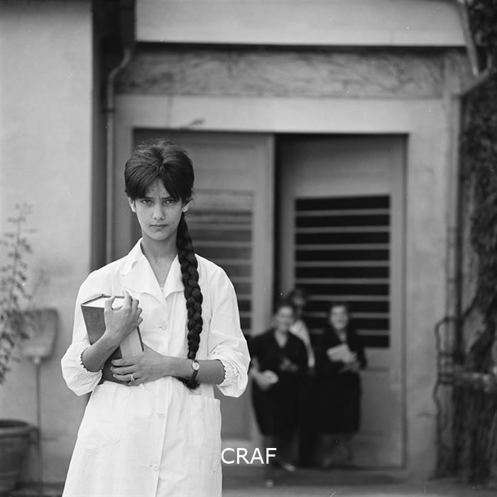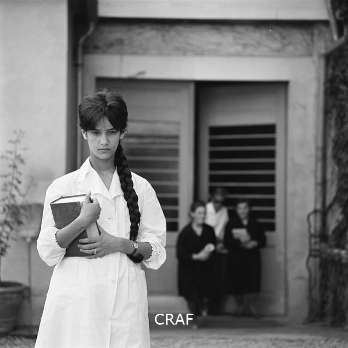 L'immagine ritrae una ragazza con grembiule bianco e dizionario in mano, un...