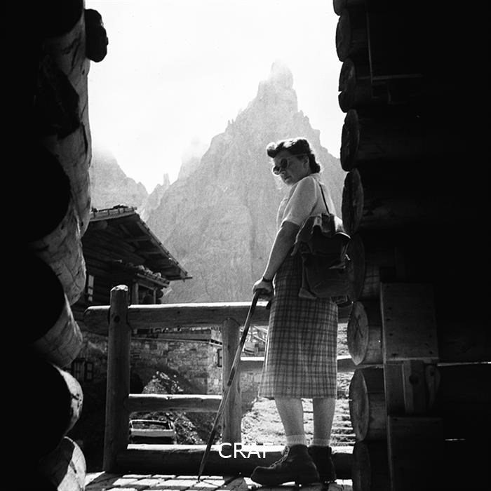 Ritratto di una donna accanto al parapetto di una baita, pronta alla partenza...