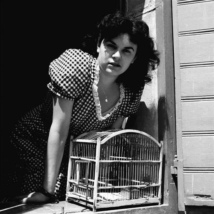 Ritratto di una donna con un abito a quadretti bianchi e neri alla finestra di...