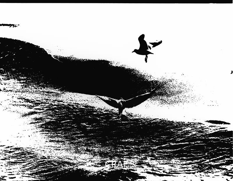 Immagine che ritrae dei gabbiani che sorvolano il mare, uno dei quali si getta...