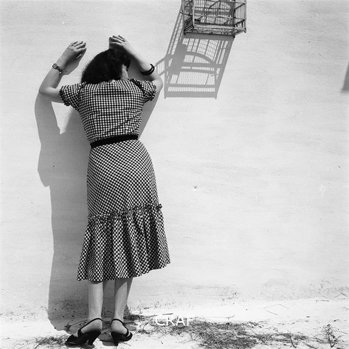 Ritratto di una donna appoggiata ad un muro bianco con un abito a quadretti...
