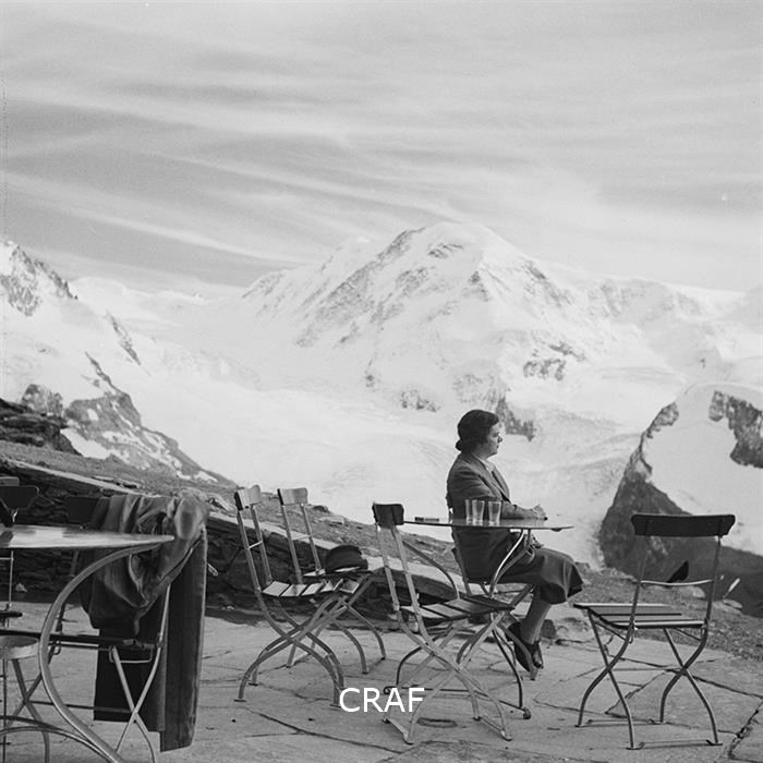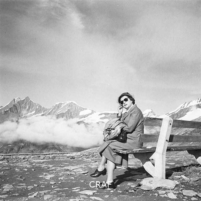 Ritratto di una donna seduta su di un muretto alla stazione di Gornergart, ...