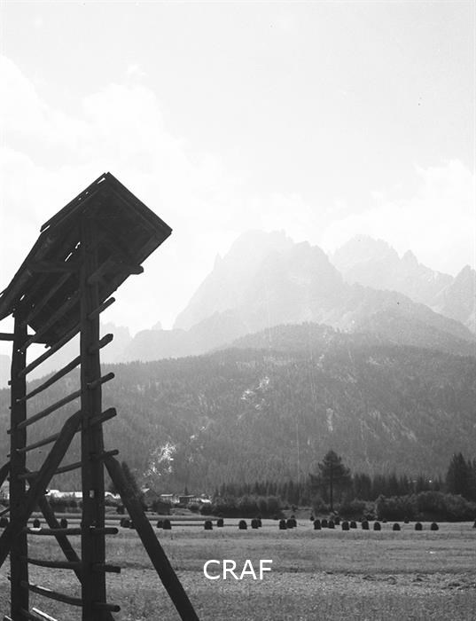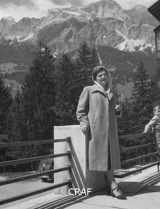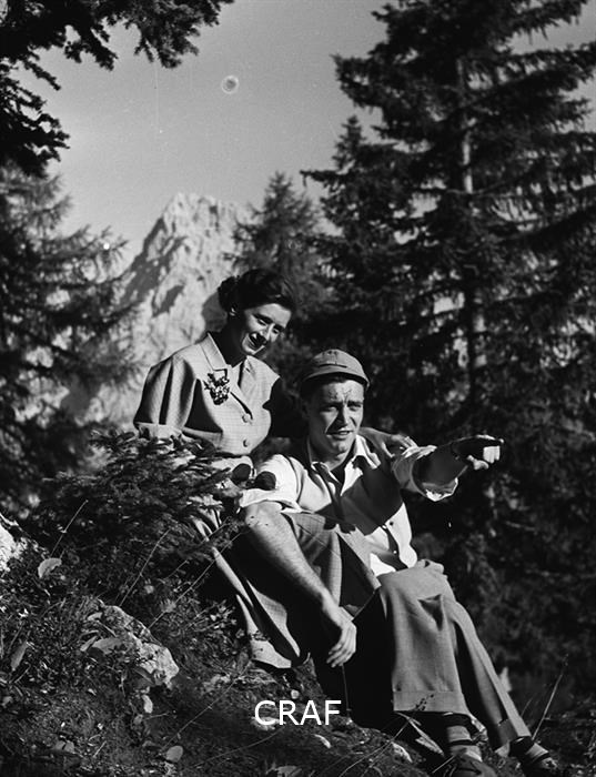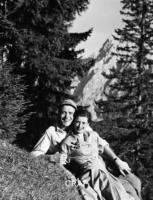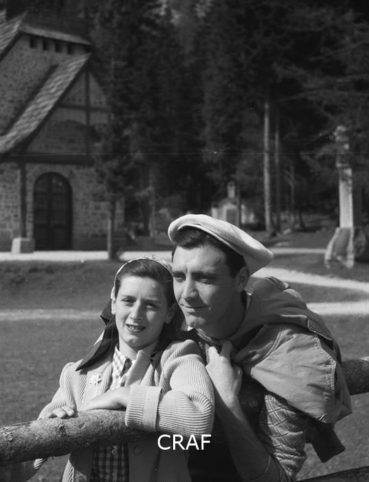 Ritratto di una coppia di ragazzi, sullo sfondo un edificio tipicamente montano...