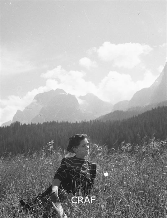Ritratto di una ragazza seduta a terra nell'erba alta, sullo sfondo si staglia...