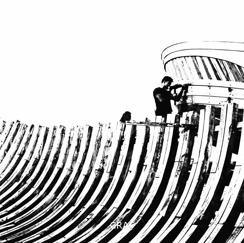 Ritratto di un artigiano al lavoro sullo scafo di una barca in costruzione