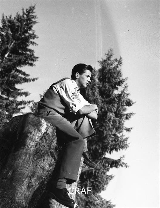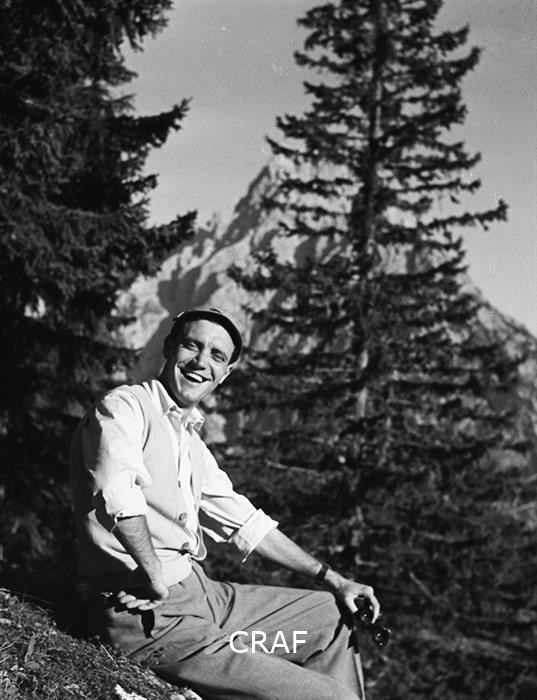Ritratto di un uomo sorridente e divertito, alle sue spalle una veduta montana...