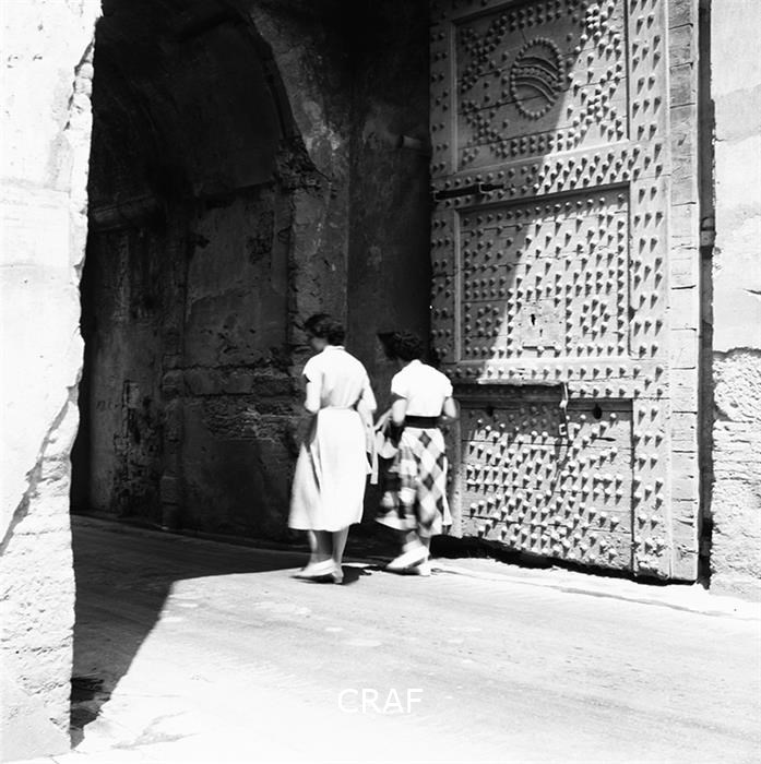 L'immagine ritrae due donne mentre camminano ed attraversano un portale