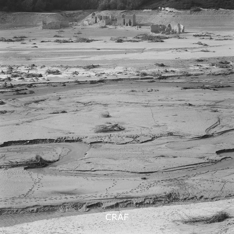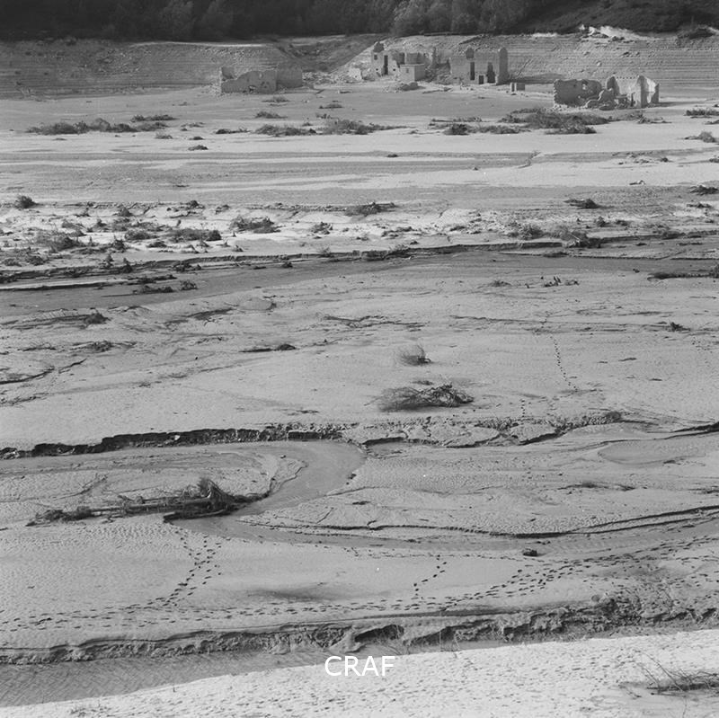 Veduta in lontananza di alcuni ruderi superstiti dopo la secca di un lago