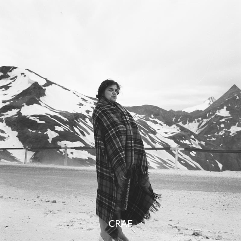 Ritratto di una donna con coperta, alle sue spalle la veduta di una montagna...