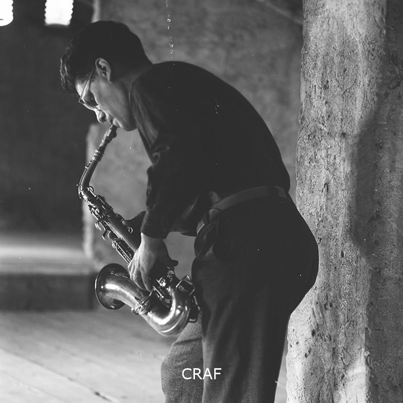 Ritratto di un ragazzo mentre suona il sassofono all'interno di una soffitta