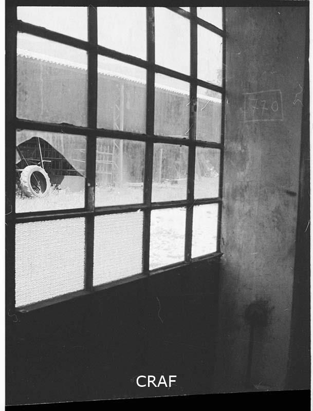 Particolare della vetrata di un'officina vista dall'interno. Sulla sinistra,...