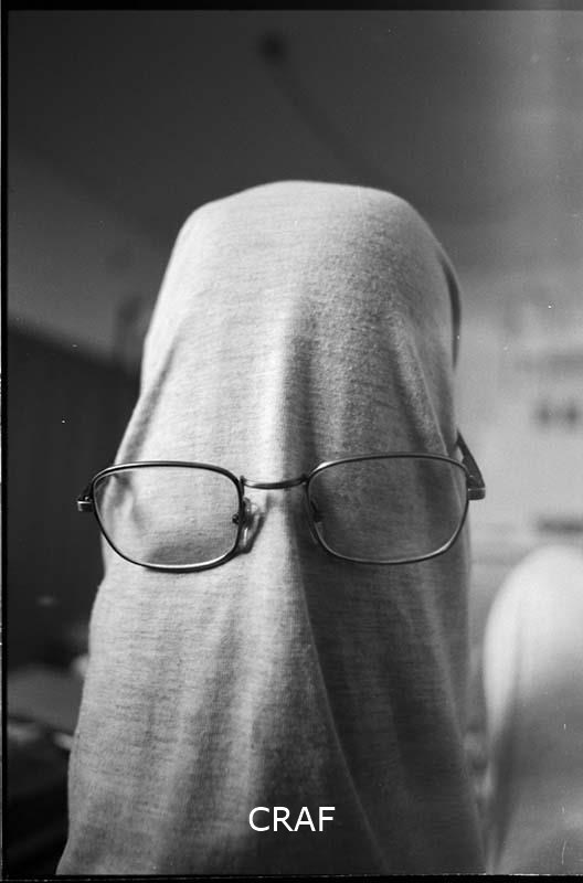 Autoritratto giocoso di Aldo Beltrame in un interno. Gli occhiali da vista del...