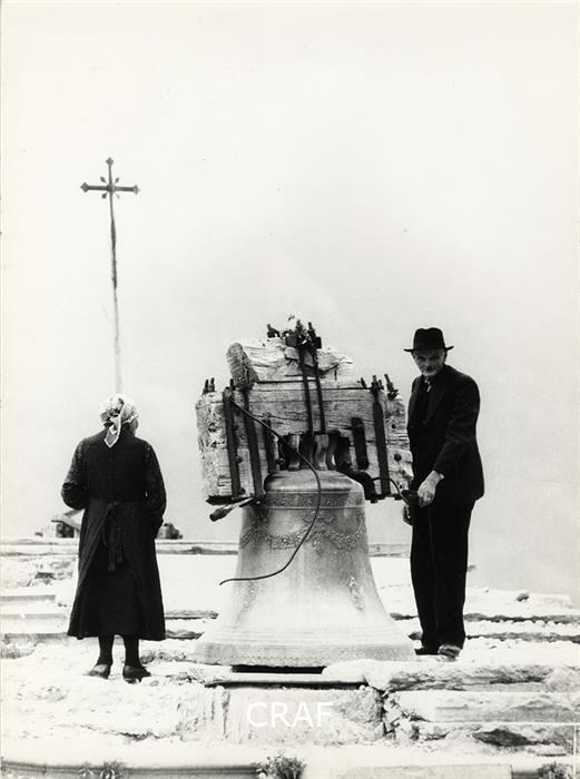 L'immagine ritrae una campana poggiata a terra, un uomo e una donna anziani...