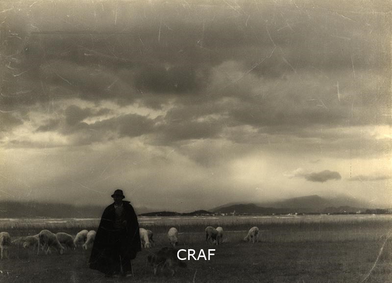 L'immagine ritrae un pastore con il suo cane e le sue pecore sullo sfondo del...