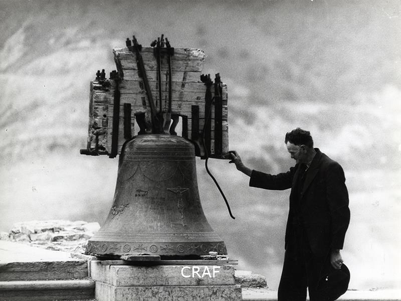 L'immagine ritrae una campana poggiata a terra, un uomo anziano accanto ad...