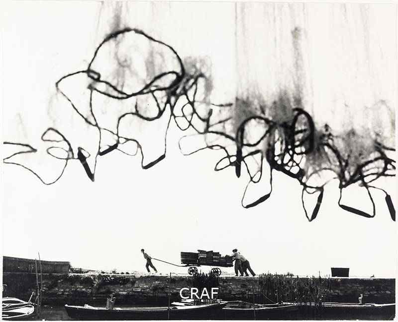 L'immagine ritrae tre uomini mentre trainano e spingono un carro sul molo dove...