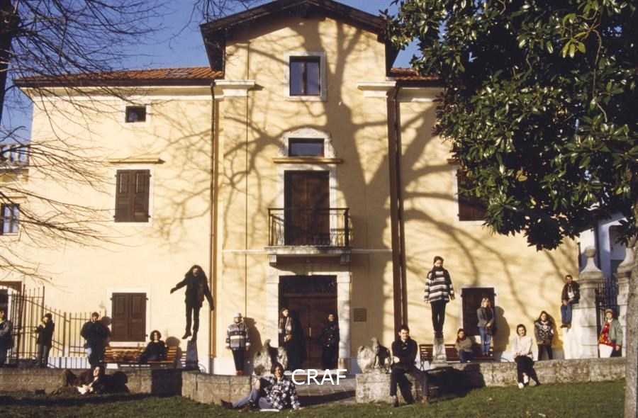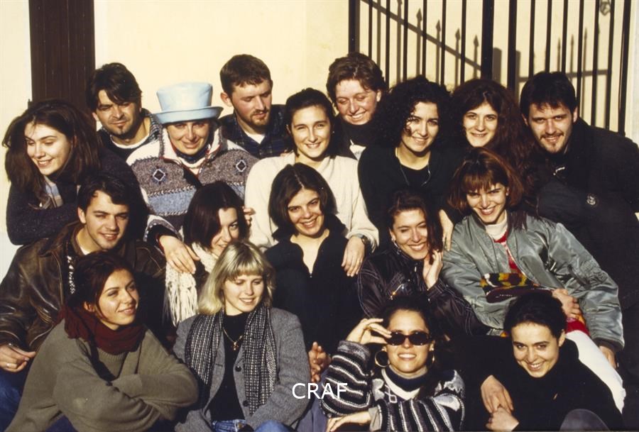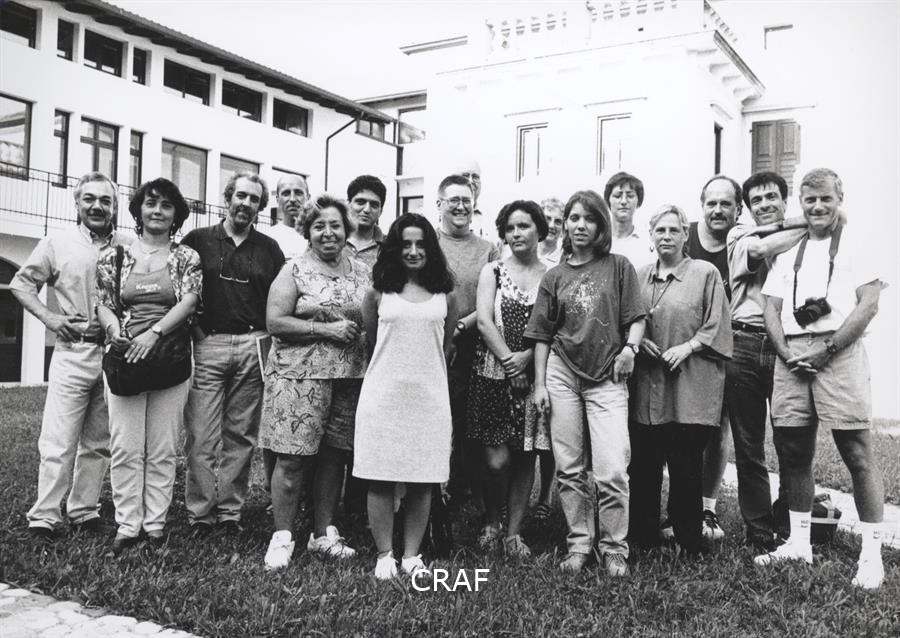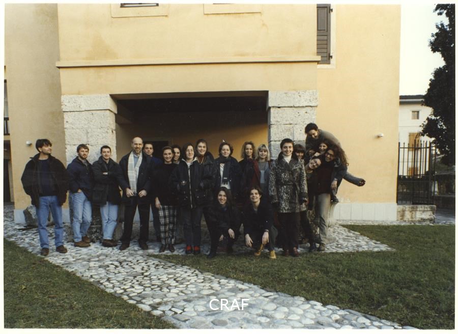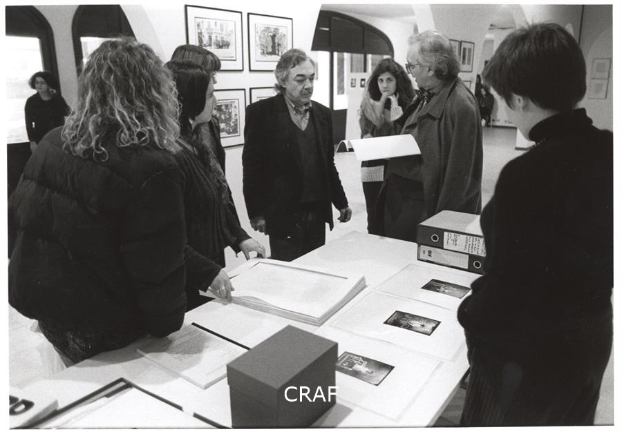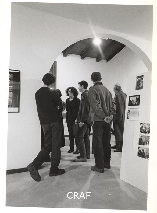 Gli studenti del corso FSE Cultura della Fotografia organizzato dal CRAF tra il 25 ottobre 1996 e il 27 febbraio 1997 aspettano di presentare i loro lavori agli esaminatori. Tra questi il prof. Italo Zannier (di schiena, a destra).