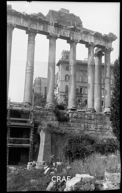 Veduta del Tempio di Saturno nel Foro Romano.