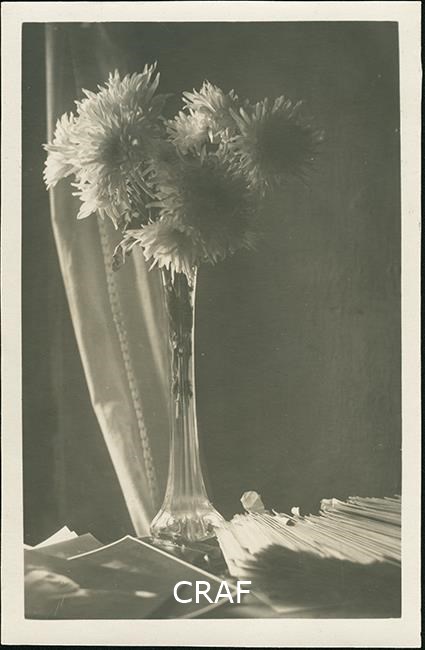 Composizione con vaso di fiori, fotografie e lettere.