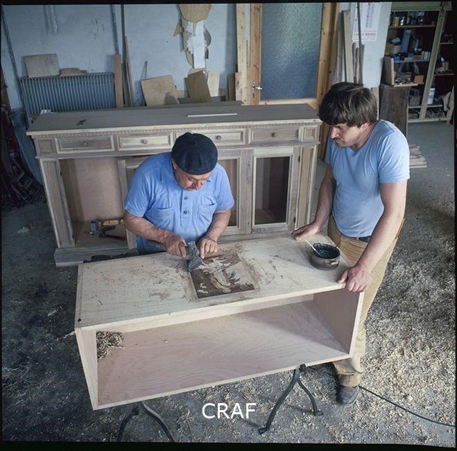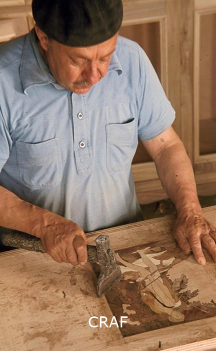 Luigi Costaperaria esegue un lavoro di intarsio affiancato da un assistente