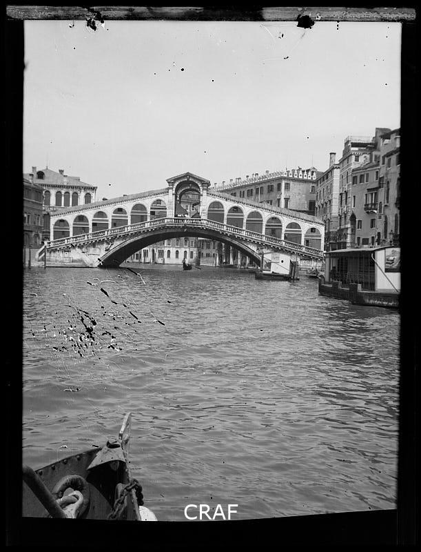 Veduta del Ponte di Rialto sul Canal Grande a Venezia ripresa dalla gondola.