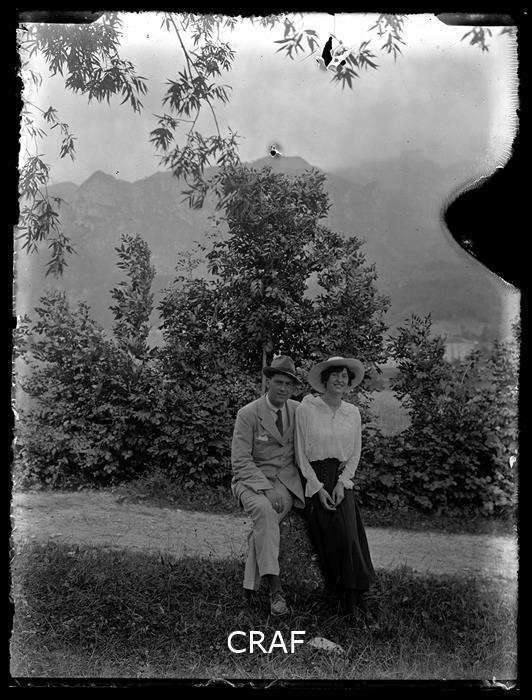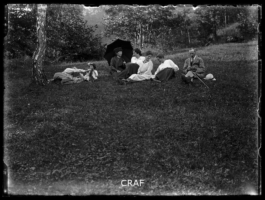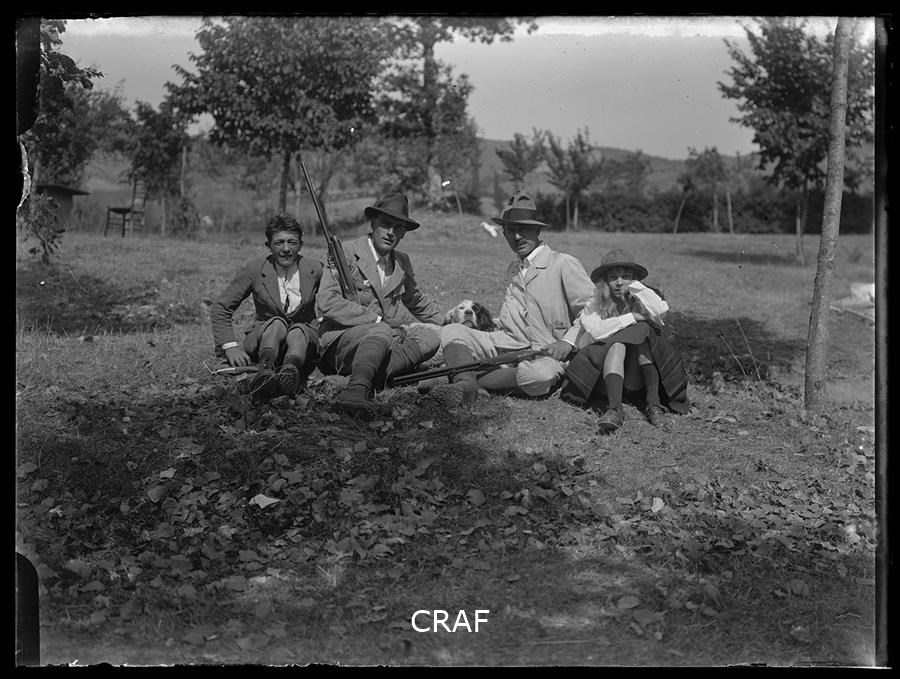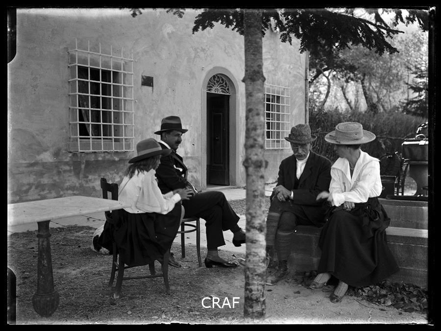 Ritratto di una bambina, due uomini e una donna seduti in giardino
