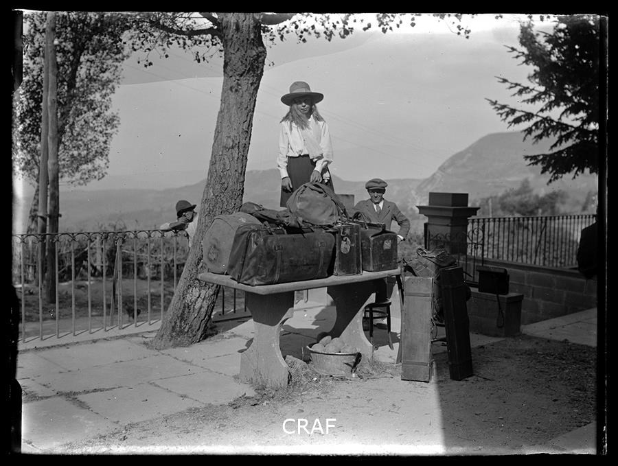 Ritratto di una bambina in piedi su un tavolo da giardino riempito da valigie,...