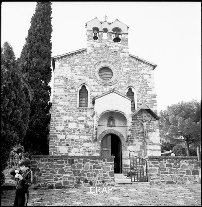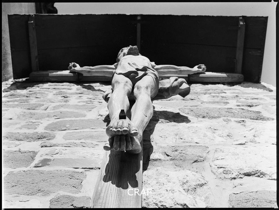 Veduta prospettica del crocifisso ligneo sulla facciata della chiesa di Santo...