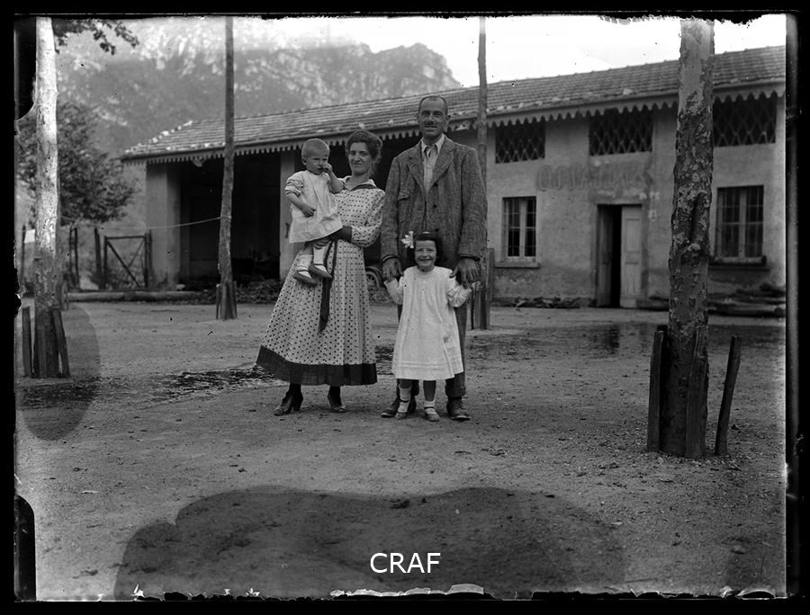 Ritratto di una famiglia composta da padre, madre e due bambini nel cortile di...