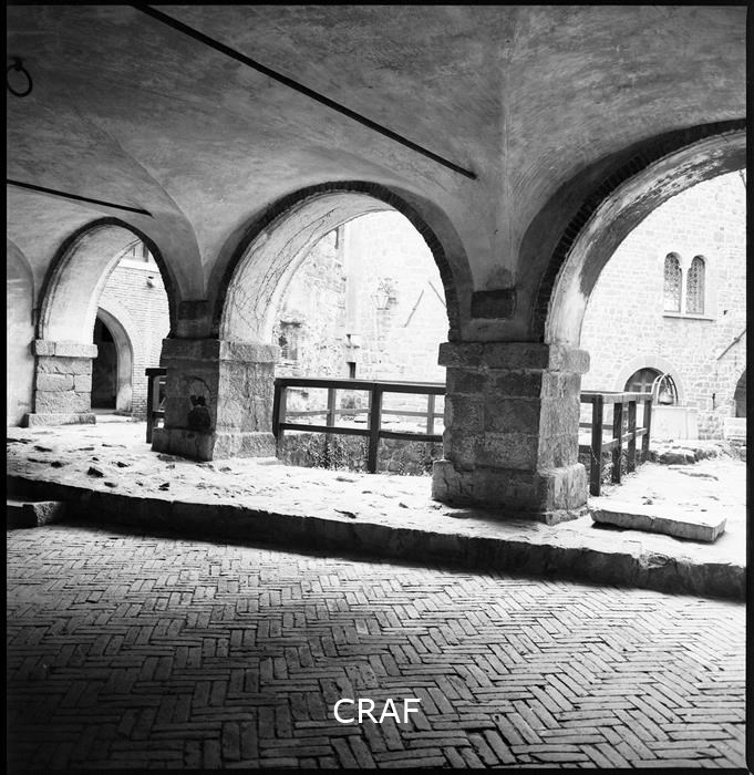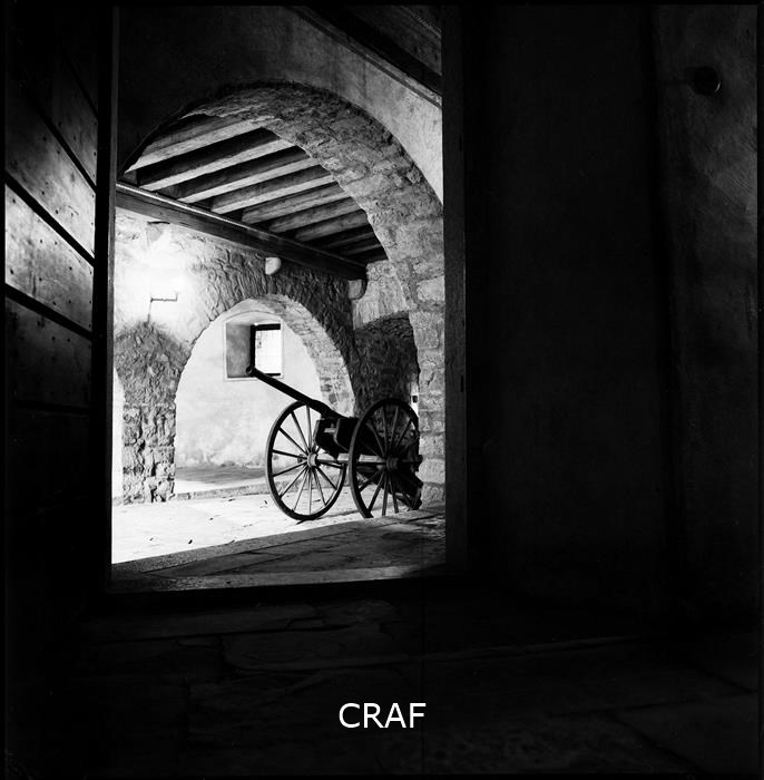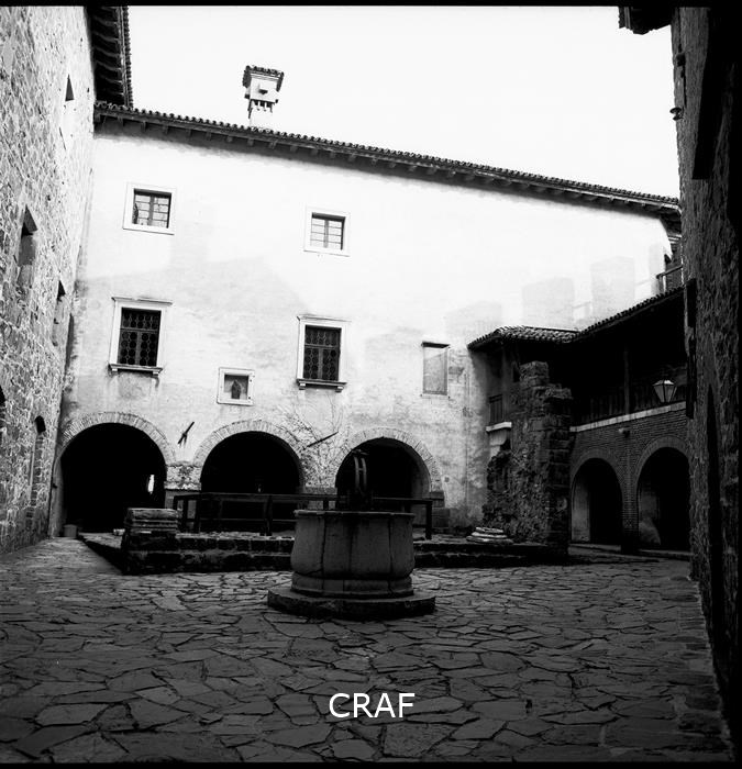 Scorcio del cortile interno del castello di Gorizia, al centro un cannone...