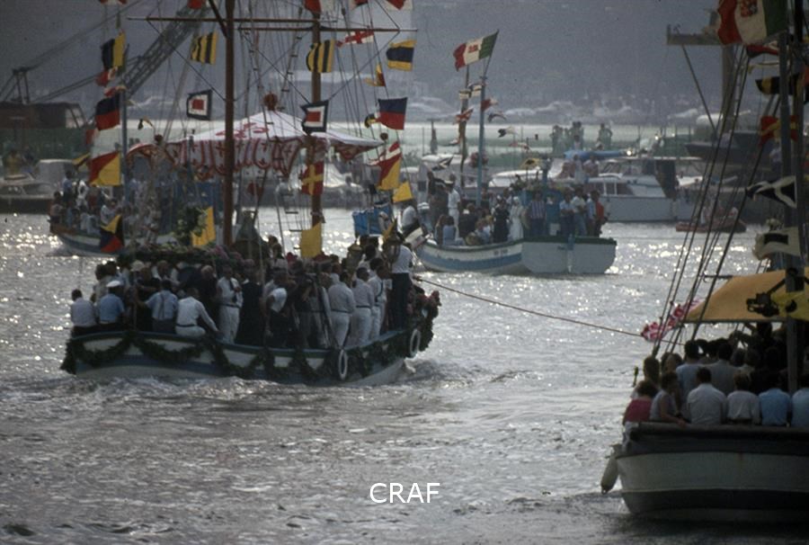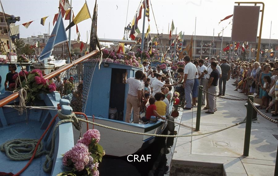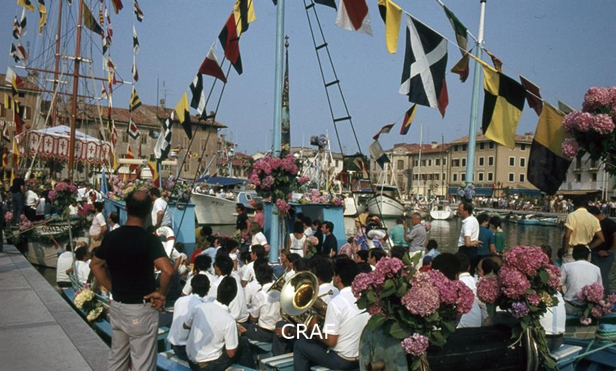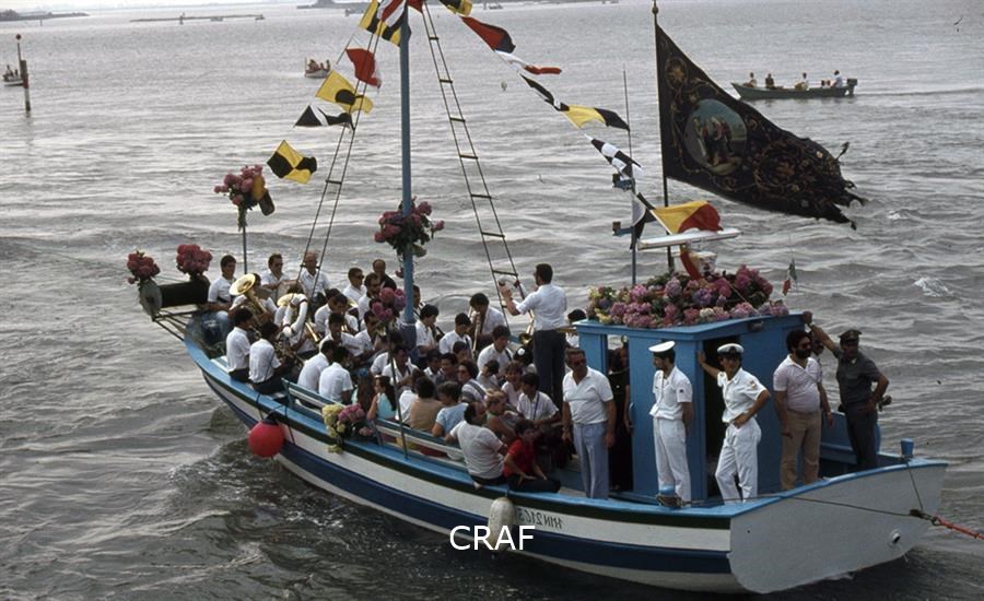 Veduta di una barca in processione verso Barbana