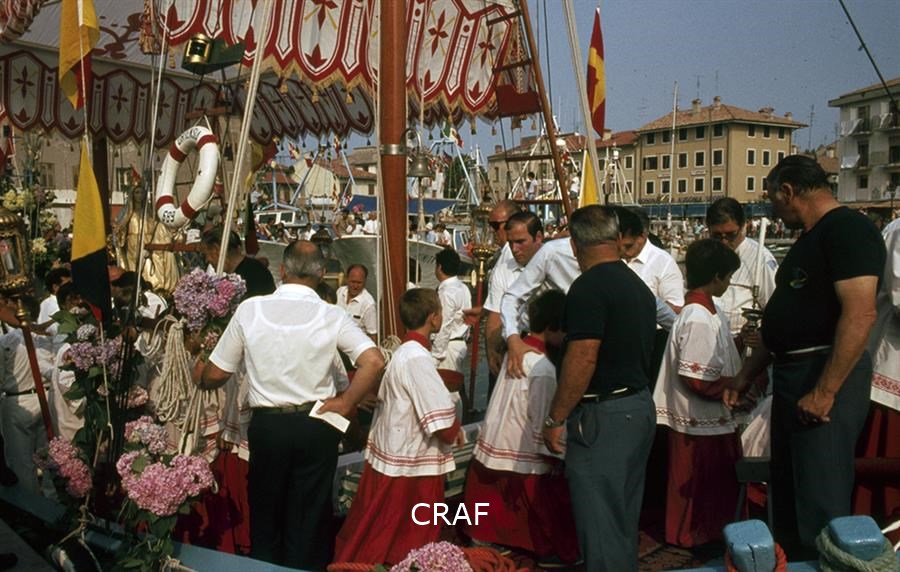 Un gruppo di persone imbarca i chierichetti in partenza per Barbana dal porto...