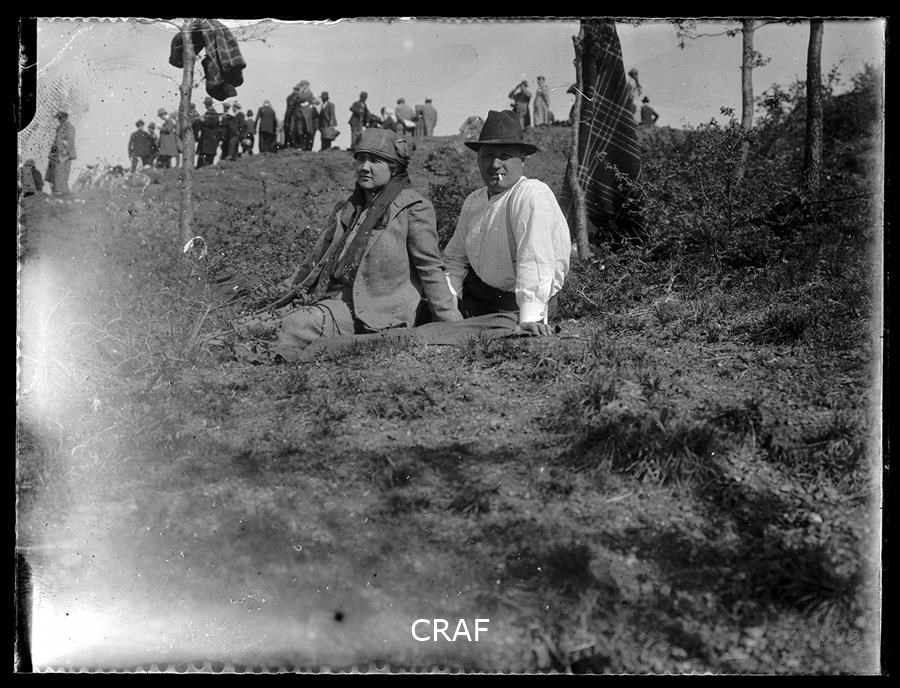 Ritratto di una donna e un uomo seduti su di un prato durante una gara automobilistica